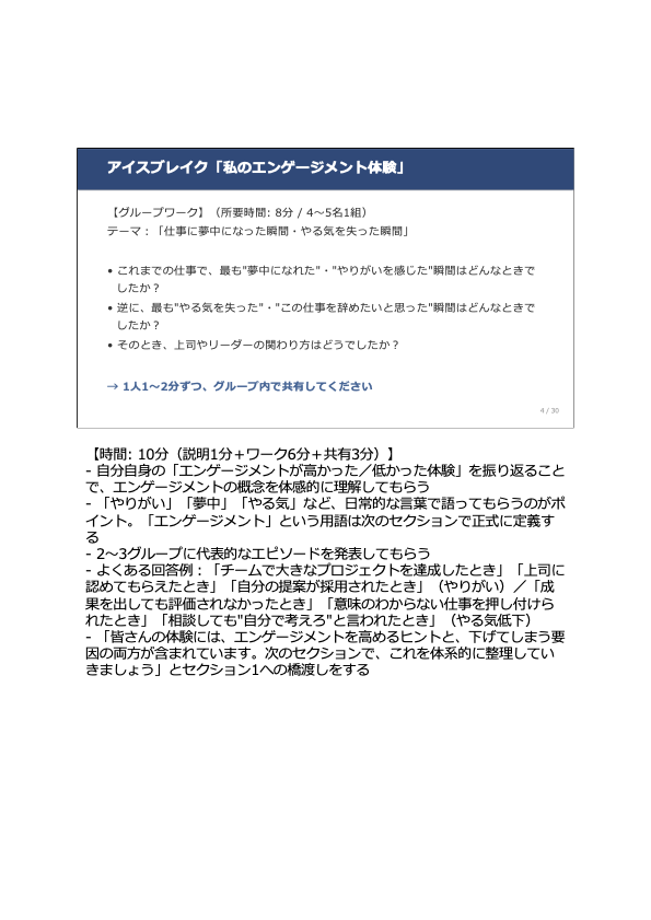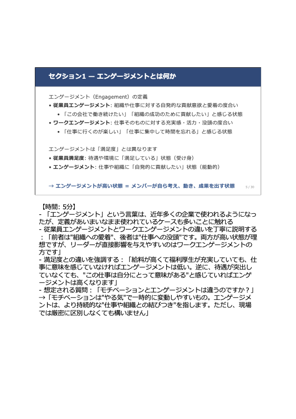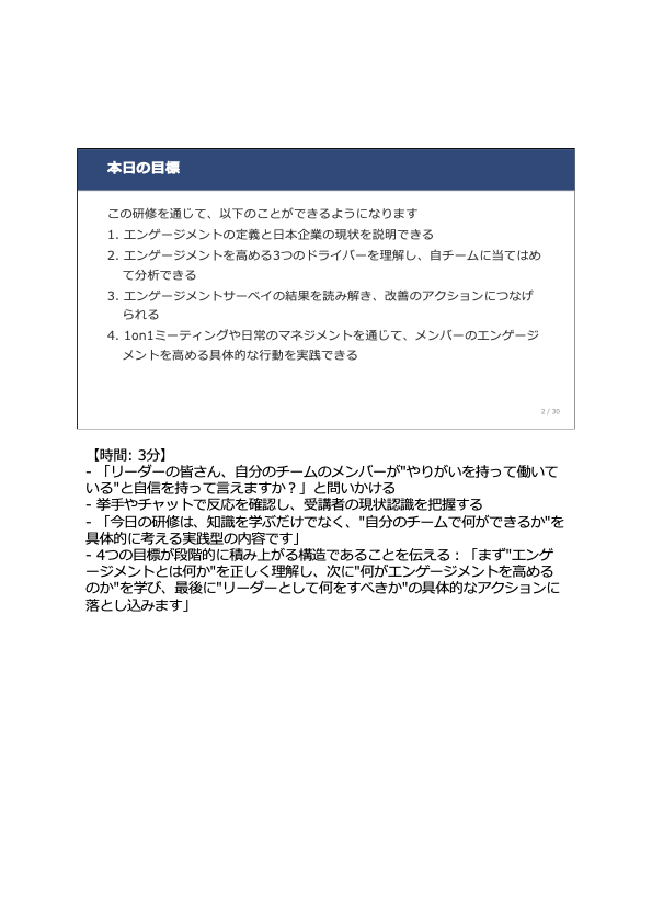 本研修マニュアル「エンゲージメント向上のマネジメント」は、研修時間3時間・スライド31枚で構成されています。サーベイ読み解きワーク、架空のチームを使ったケーススタディ、1on1設計シートなど、実践型の演習を多数収録しています。