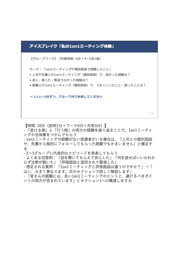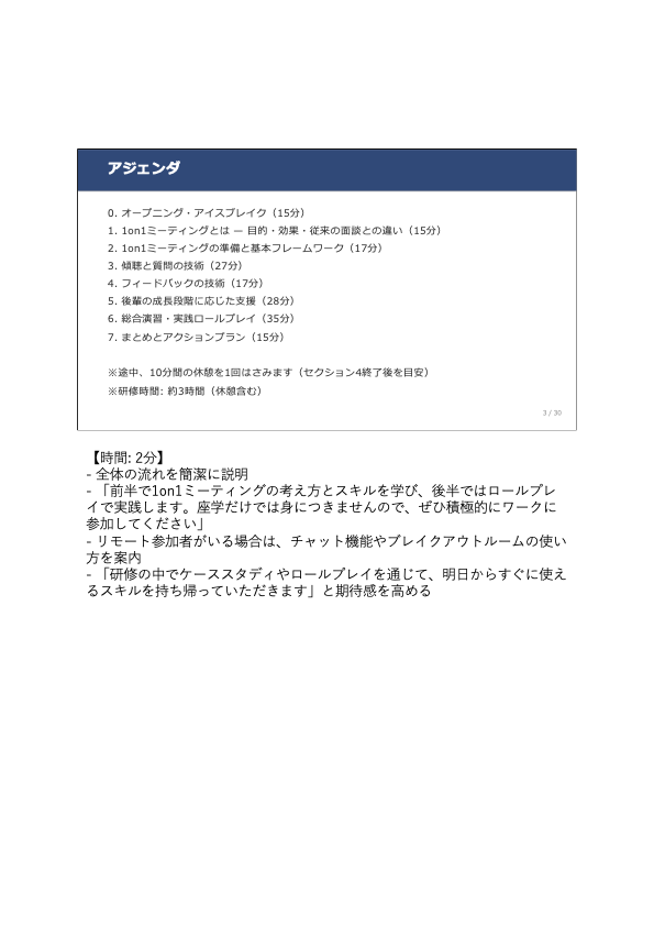 第一に、講師ノートの充実度です。各スライドに「時間配分・ファシリテーションのヒント・想定される受講者の質問と回答例」が記載されており、研修経験が少ない講師でも迷わず進行できます。リモート参加者向けのブレイクアウトルーム・チャット活用の工夫も含まれています。