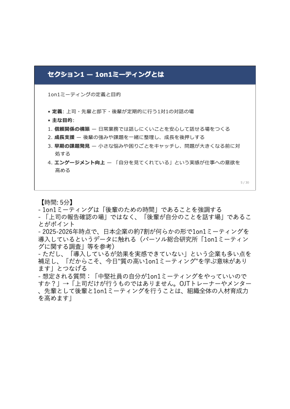 セクション1「1on1ミーティングとは」では、定義・目的・従来の面談との違いを整理したうえで、リモートワーク定着・Z世代の職場参入・人材の流動化・DE&I推進という2025-2026年の環境変化を背景に、なぜ今1on1ミーティングが必要なのかを丁寧に解説します。受講者が「なぜ学ぶか」を腹落ちした状態でスキル習得に入れるよう設計されています。