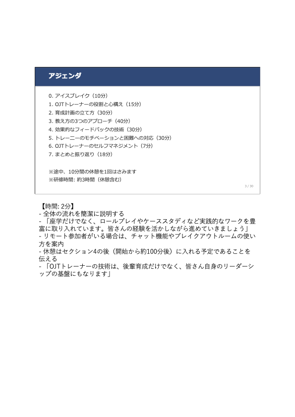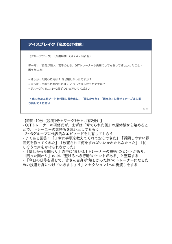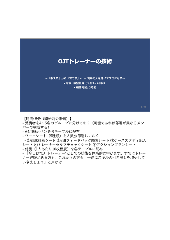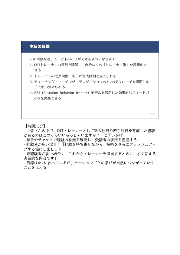 - OJTトレーナーの役割を理解し、自分なりの「トレーナー像」を言語化できる
