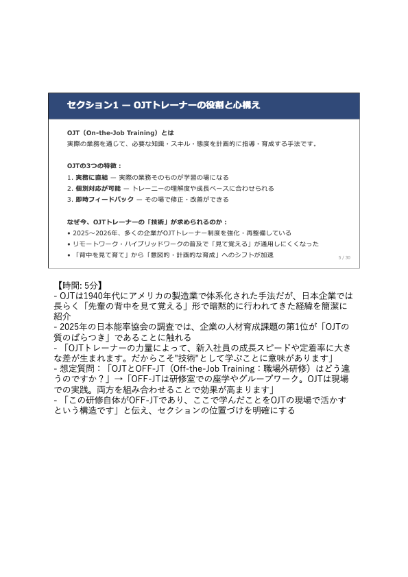 セクション1「OJTトレーナーの役割と心構え」では、OJTの定義・特徴・なぜ今「技術」として学ぶ必要があるかを整理します。業務遂行力・言語化力・観察力・忍耐力・成長志向という5つのトレーナー資質を自己診断し、「完璧なトレーナーを目指すのではなく、トレーニーと一緒に成長するトレーナーになる」というスタンスを醸成します。