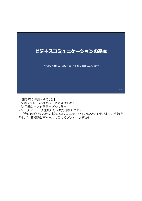 社内講師が初めてこのプログラムを担当する場合でも安心して進められるよう、講師ノートには以下を記載しています。
