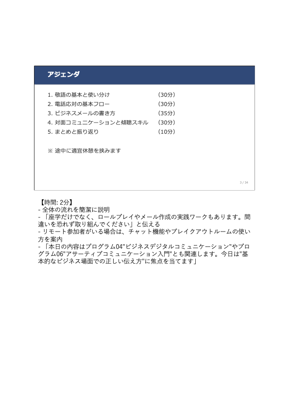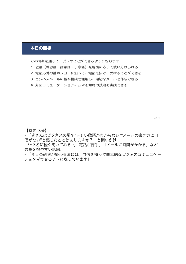 - 各スライドの推奨所要時間(例:「敬語変換チャレンジ:説明1分+ワーク5分+共有2分」)