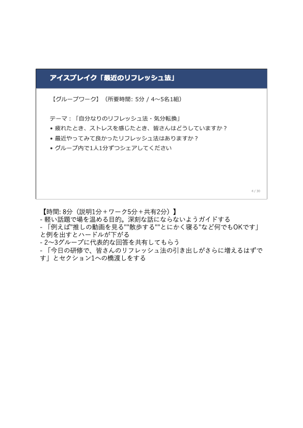 本プログラムの設計で特に意識したのは、Z世代の学習特性への配慮です。一方的な講義ではなく、個人ワーク・グループワーク・ケーススタディを組み合わせた体験型の構成にしています。また、「デリケートな内容を含むため、無理な自己開示を強要しない」という心理的安全性への配慮を講師ノートに明記し、参加者が安心して取り組める環境設計を重視しています。