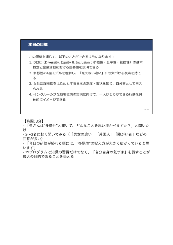 2023年3月期から有価証券報告書での開示が義務化された3指標(女性管理職比率・男女間賃金格差・男性育休取得率)が示すように、DE&Iは企業の説明責任の一部になりました。数字を開示するだけでなく、「改善する組織文化」をつくるためには、新入社員の段階から「多様性の当たり前」を育てることが最も根本的な施策です。