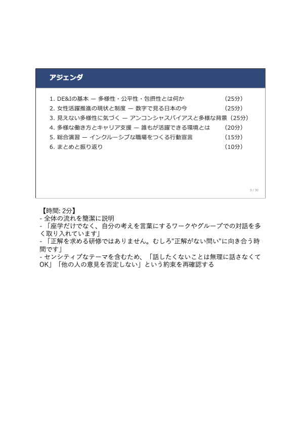 この研修は、DE&I(Diversity, Equity & Inclusion:多様性・公平性・包摂性)の理論的基盤から近年の最新制度動向、そして「インクルーシブな職場をつくる日常行動」まで、一貫した流れで構成された新入社員向け研修プログラムです。