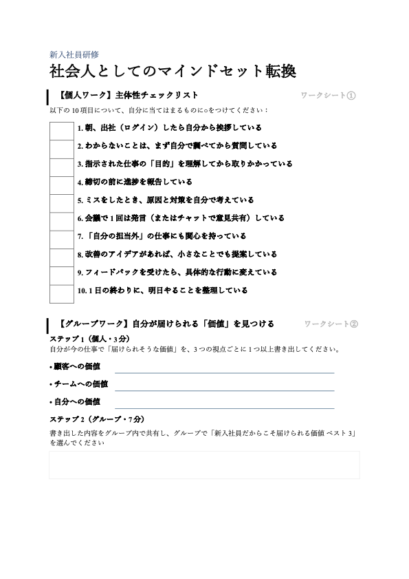 購入者は教材を社内研修などで、自由にコピーなどして利用できます。また活用しやすいように、編集、アレンジ、修正して使うこともできます。ただしマニュアル、シート、ワークシート等を第三者に譲渡、インターネット上などでの配布、生成AIサービスへアップロードすること、レンタル、販売および著作物の制作に使用すること、無断で転用することは禁止致します。