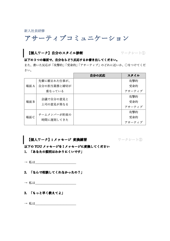マニュアルやシート、ワークシートは、購入いただいた方々が、研修ニーズや状況に合わせて、手順や内容を加筆、修正して活用していただいて構いません。研修効果を挙げるためには内容を受講生やニーズに合わせてカスタマイズしていただいた方が望ましいかもしれません。またインストラクターによっては、研修を展開するパターンが異なりますので、自己のパターンにあわせ大幅に修正し、活用することも必要になると思います。このマニュアルとシートを参考に、新しいレッスンプランを作成して、効果的な研修の実施にお役立ください。